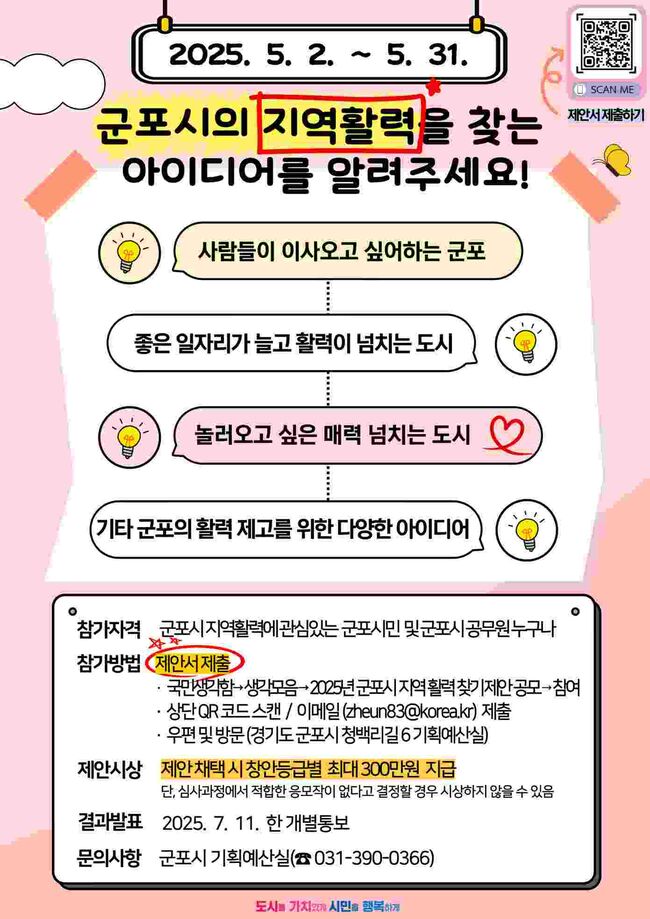 [TBA뉴스=김시창 기자] 군포시는 시민과 함께 지역의 활력을 되찾고 도시 경쟁력을 높이기 위해 오는 5월 2일부터 5월 31일까지 『2025년 군포시 지역 활력 찾기 제안 공모』를 실시한다고 밝혔다.