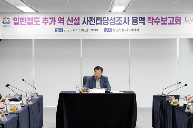 교통기획과-신상진 성남시장이 18일 시청 제1회의실에서 열린 일반철도 추가 역 신설 사전타당성조사 용역’ 착수보고회에서 인사말을 하고 있다