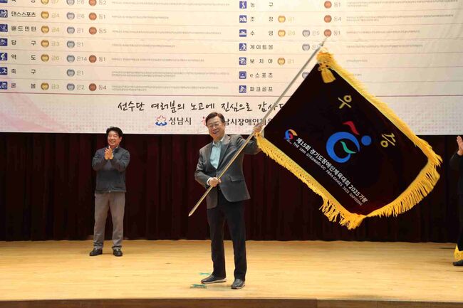 1. 신상진 성남시장이 제15회 경기도장애인체육대회 출전선수단 해단식에 참석해 우승기를 흔들고 있다 ⓒTBA뉴스