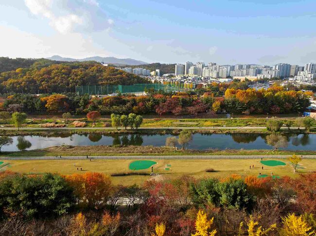 금곡공원 구간에 들어서면 풍경은 한결 넉넉해진다. 불정교 아래에는 비가 와도 즐길 수 있는 테니스 연습장이 꾸준히 사람들을 부른다. 이곳의 가을은 활동과 휴식이 공존한다. 공원의 평평한 잔디 위에 앉아 강바람을 맞다 보, 탄천이 성남 도심 리듬을 조정하는 거대한 호흡기처럼 느껴진다.
